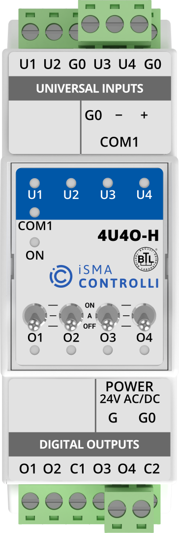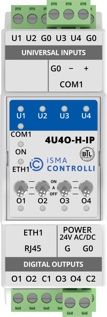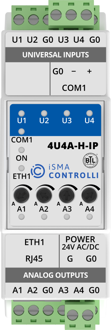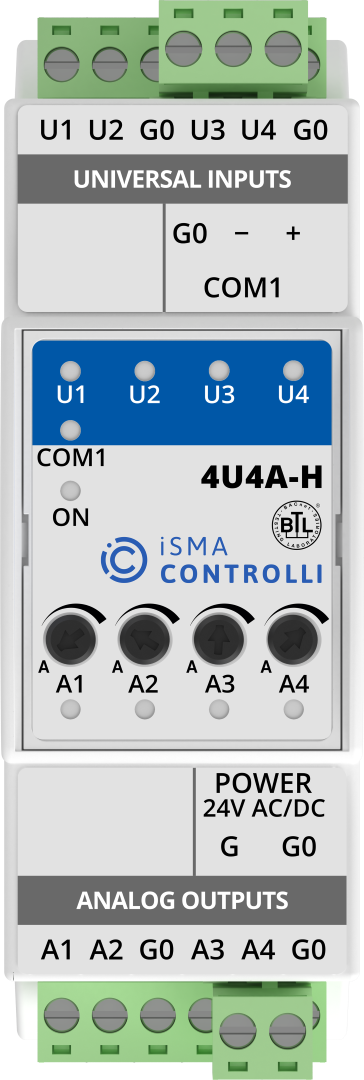 iSMAAbout the product iSMA-B-4U4A-H has 4xUI (Universal Inputs) and 4xAO (Analog Outputs). UI can work in 5 different modes: temperature, voltage, c...